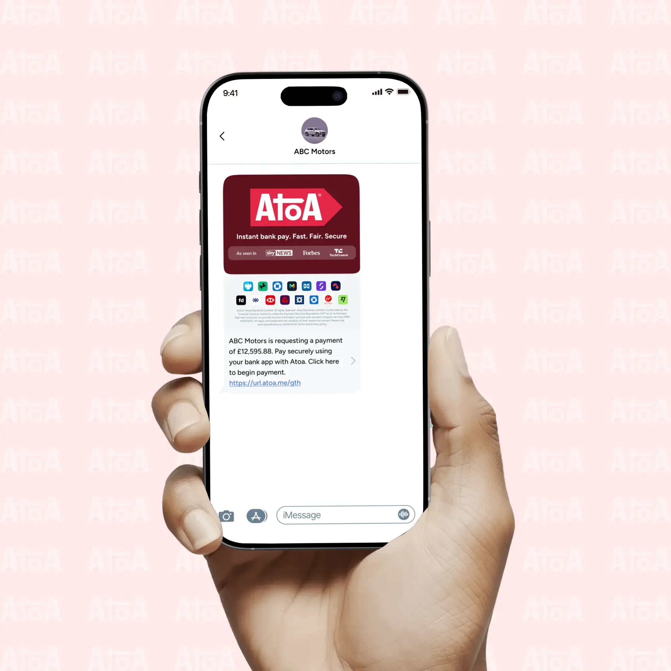 Customers enjoy a safe and secure payment experience with Atoa. All they need is a UK bank app on their phone to pay your dealership or garage instantly without signing up or downloading any new apps.
