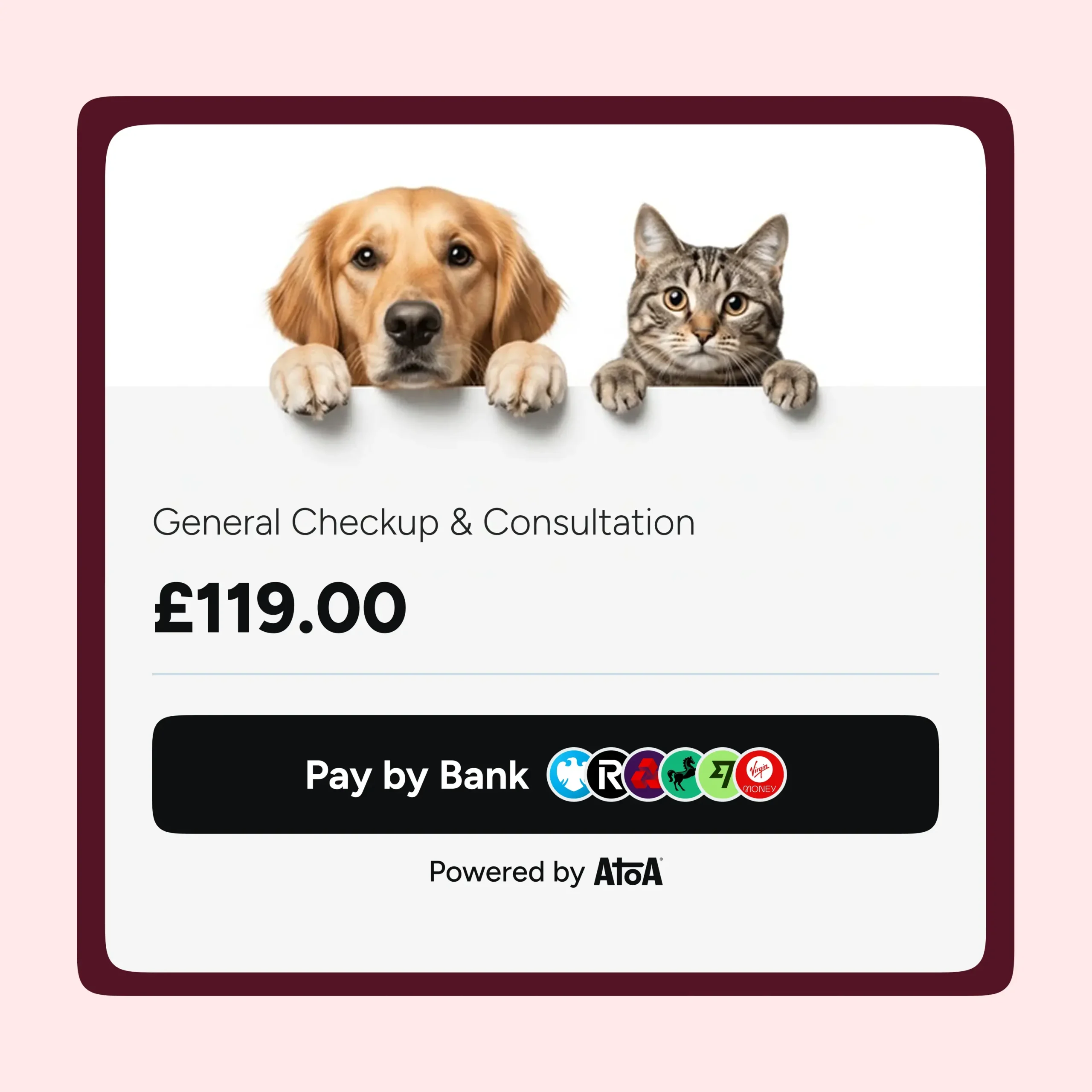 Atoa brings this to vet practices through QR codes at reception, payment links sent by SMS or email, and online checkout for deposits taken ahead of appointments. Because Pay by Bank bypasses card networks, fees are lower than standard card processing rates. This matters when practices are processing high volumes of transactions daily. There are no chargebacks, settlement is instant, and the client experience is clean and modern.