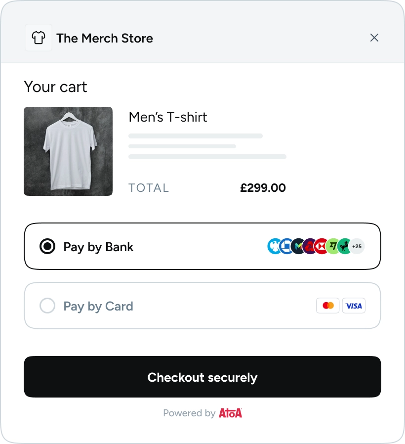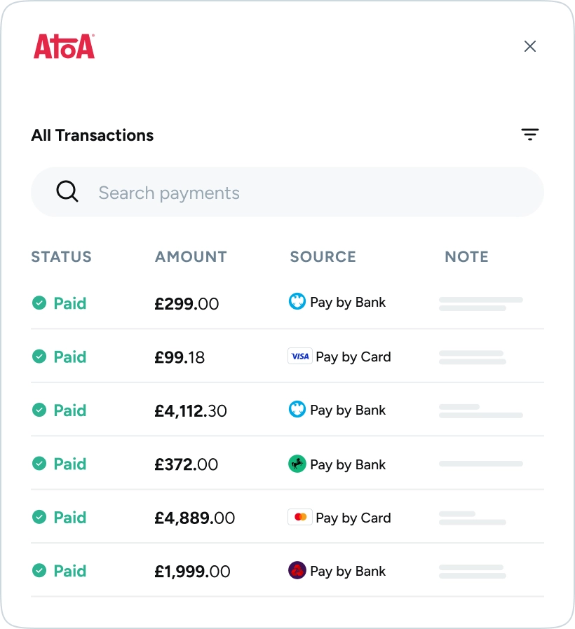 Atoa lets customers pay your business directly from their UK bank app. It’s fast, secure, and cheaper than accepting card payments.